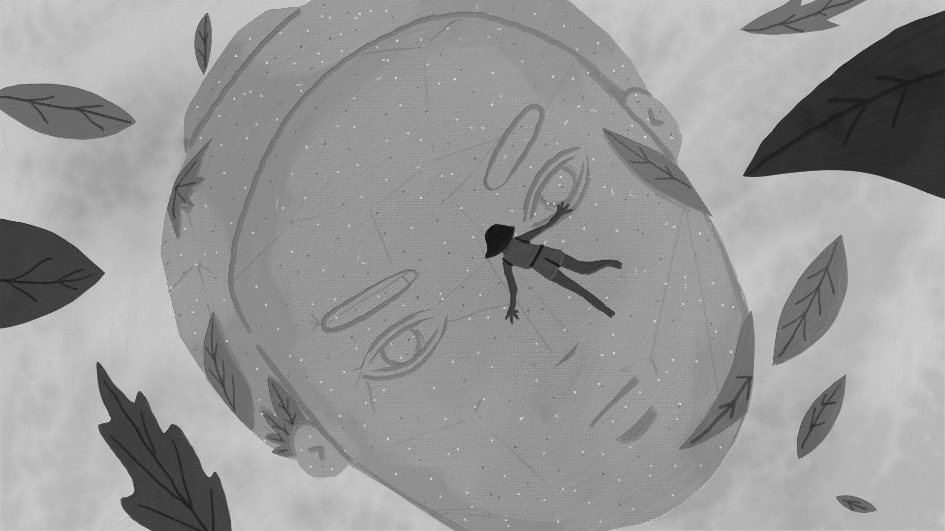 Nico lives on a shore isolated from the world. Her house is by the sea, covered by a pile of leaves that make it look like a large mound. Nico seeks independence in solitude, but by distancing from the world, she has also distanced from herself. She spends her days carving stones, collecting leaves, and avoiding the other inhabitants. Nico sees herself reflected in the surface of the sea and realizes she has no face in the water's reflection. A large wave overwhelms her, and she loses her house key. To retrieve it, she dives into the sea and swims into the darkness, surrounded by flashes of light. After her underwater experience, Nico chooses a new way of relating to the world.