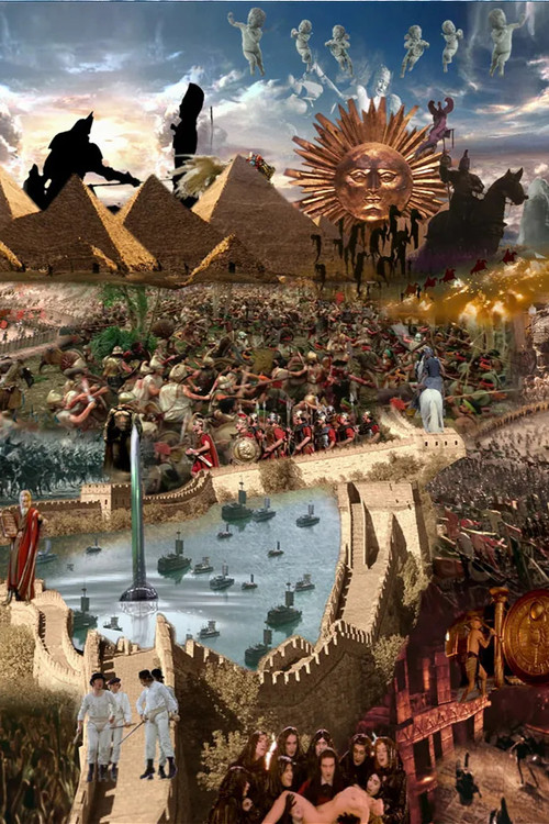 The history of humankind is illustrated as a vast side-scrolling video mural depicting the spectacle of human conflict across time through the lens of cinema.