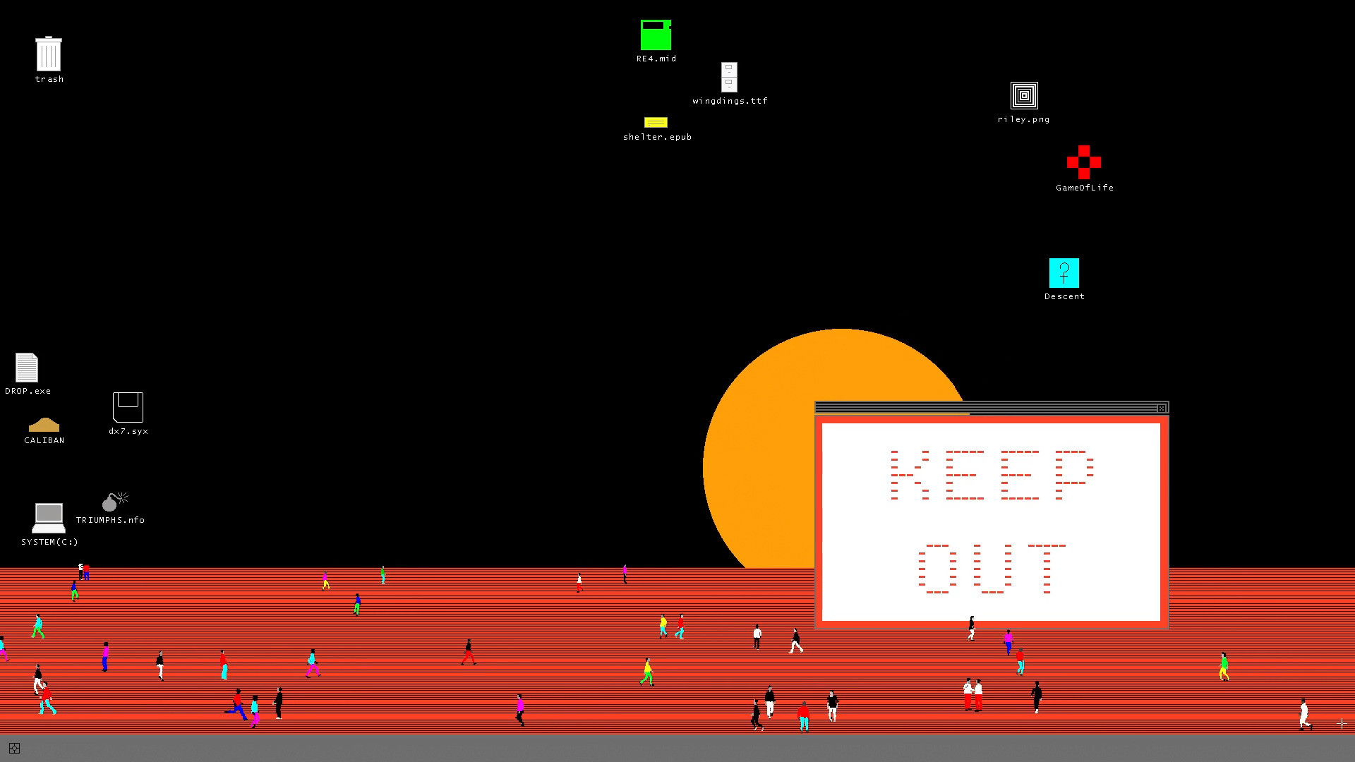Drop City is a portrait of a computer desktop community. It takes its name from the first rural hippy commune in America, a settlement in southern Colorado that formed in 1965 constructed of discarded junk, salvaged car tops, and other detritus fashioned into inventive living structures. A decade later Drop City was completely abandoned. Nothing is left of it today.